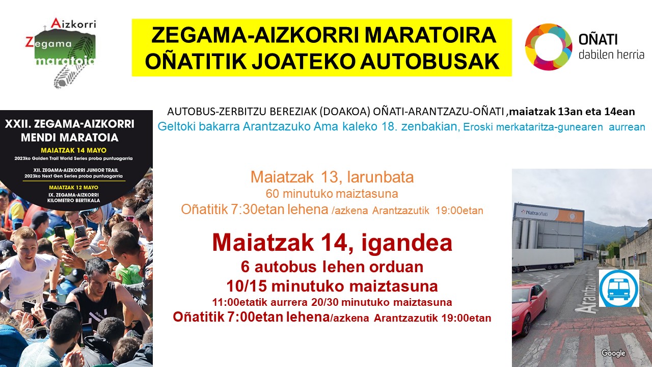 Astebukaeran Zegama-Aizkorri maratoia dela eta Oñatin AK Gune berriak zabalduko dira eta Oñatitik Arantzazura joateko doako autobús zerbitzua izango da, larunbatean eta igandean.